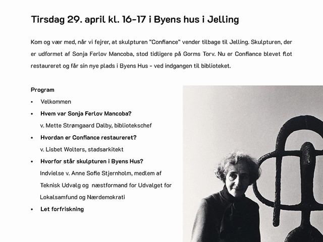 Kom og vær med tirsdag 29. april kl. 16-17, når vi fejrer, at skulpturen ”Confiance” vender tilbage til Jelling.